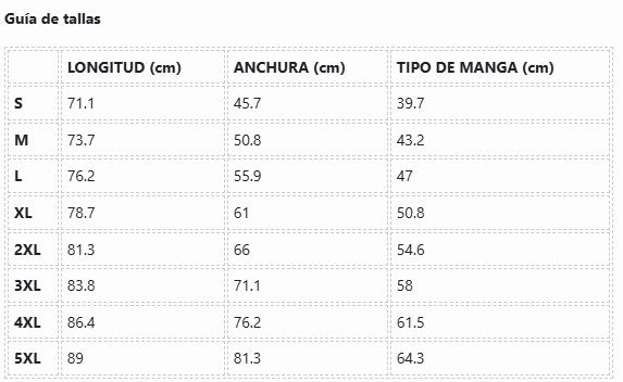 | LONGITUD (cm) | ANCHURA (cm) | TIPO DE MANGA (cm) | |